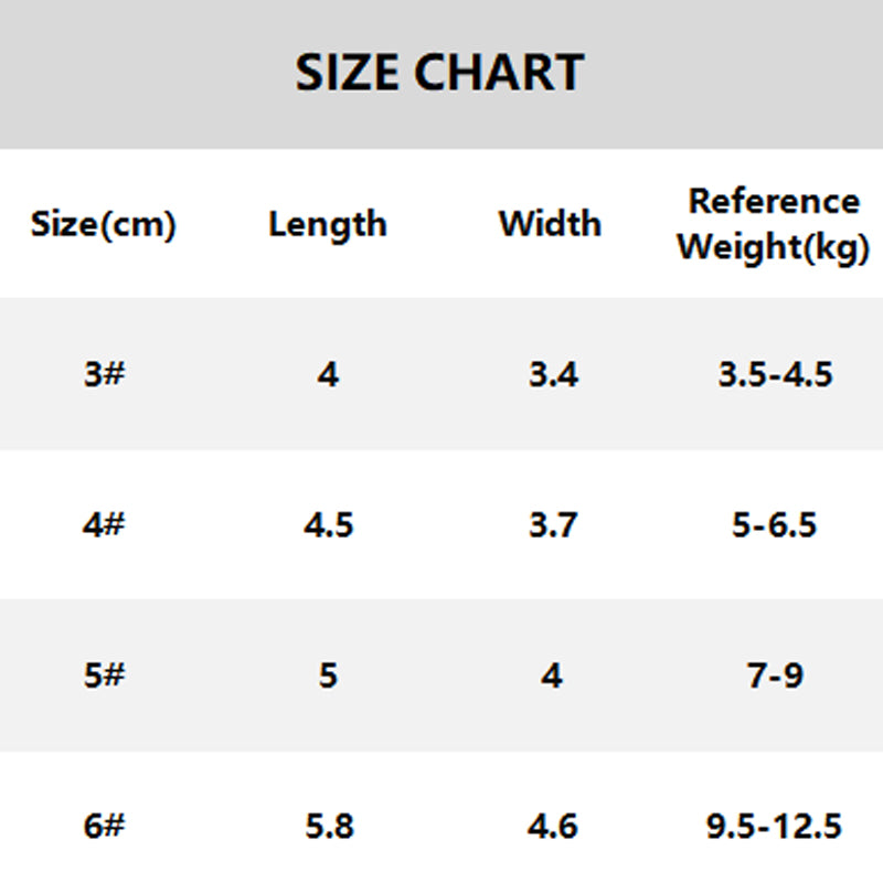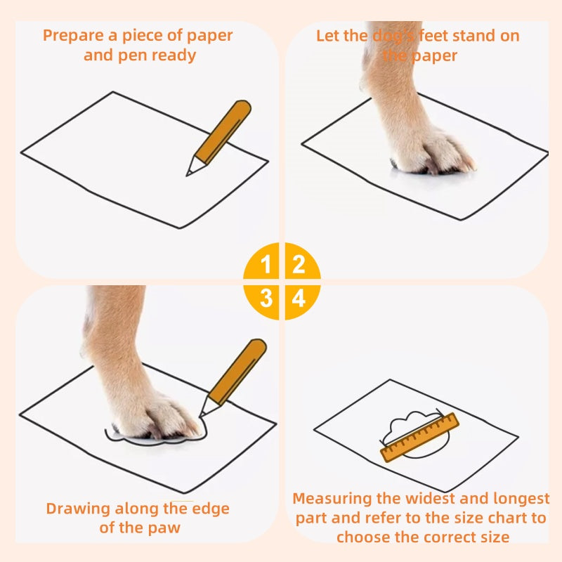 STØRRELSESVALG: For å måle riktig, la hunden stå på et papir, tegn linjer rundt poten og mål den bredeste delen. For komfort, velg en størrelse som er litt bredere enn den nøyaktige potemålingen.