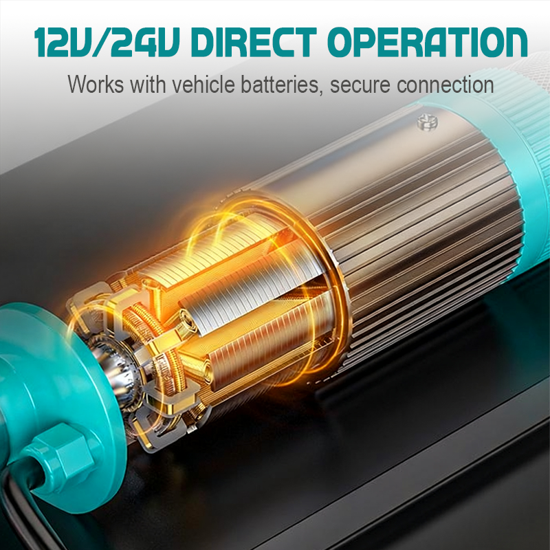 KOBLE TIL, SLÅ PÅ, PUMP - Drives direkte fra bil- eller lastebilbatterier. Kraftige kobberklemmer gir et solid grep. Låsebryteren lar deg pumpe håndfritt. Med en 3 m kabel er rekkevidden aldri et problem.