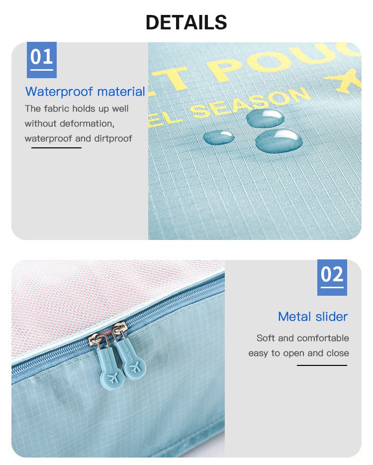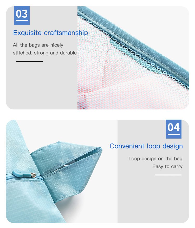 LETT OG HOLDBART: Superlett nylonstoff sørger for at klærne dine blir lagret pent i bagasjen uten å legge til ekstra vekt. Solid og glatt toveis glidelås med forlenget snor sikrer rask og enkel åpning og lukking av pakkeposene. Myk og glatt topppanel med nett kan ikke bare beskytte de delikate klærne dine mot rynker og lukt, men kan også hjelpe til med å identifisere klærne dine via synlig nett for å unngå å rote inne i hele bagasjen din.